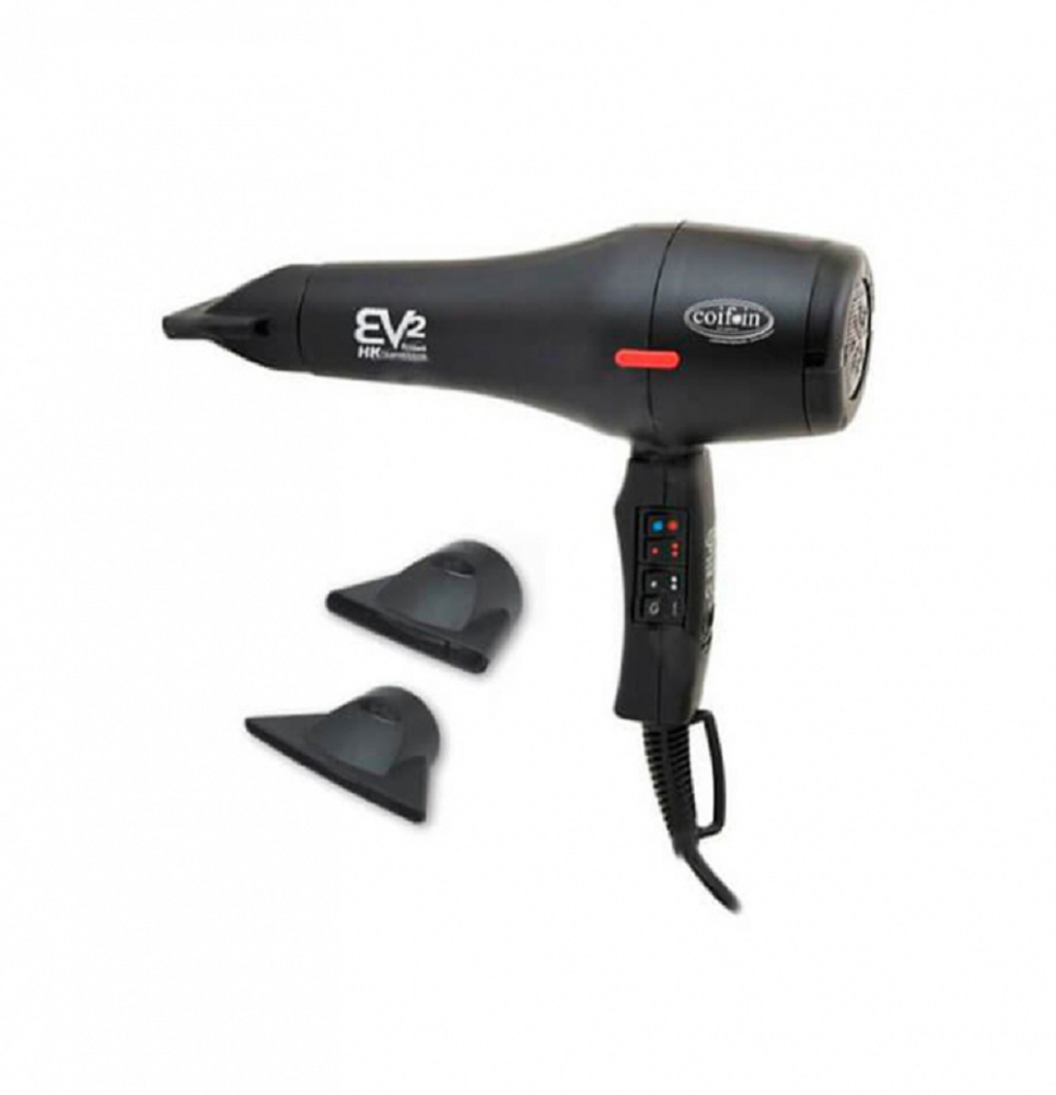 Coifin EV2 R - профессиональный фен классической удлинённой формы, к которой привыкли многие парикмахеры. Фен имеет конпку Cold Shot, выдувает воздушый поток в 6 комбинациях скорости и температуры. Весит 593 грамма, имеет эргономичный дизайн и резиновые вставки на боковой поверхности, предотвращающие скольжение.