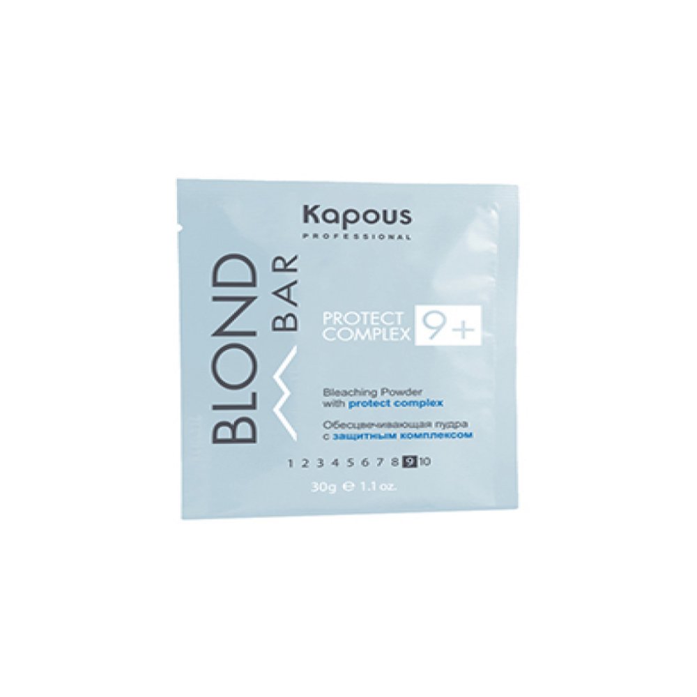 Пудра с защитным комплексом 9+ серии «Blond Bar» обесцвечивает натуральные волосы до 9 тонов. За счёт входящего в состав защитного комплекса максимально сохраняется внутренняя структура волос (S-S связи) в процессе обесцвечивания. При смешивании с окислительной эмульсией пудра приобретает кремообразную консистенцию. Легко наносится, не увеличивается в объёме и не образует пыли