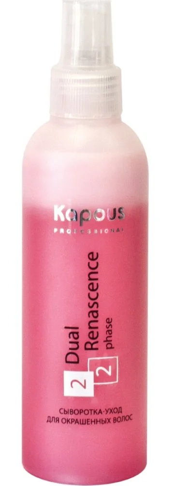Для сохранения интенсивности и насыщенности оттенка окрашеннных волос компания Kapous предлагает сыворотку-уход для окрашенных волос Dual Renascence 2 phase. Средство способно не только оставить надолго цвет на Ваших прядях, но и позаботиться о здоровье Ваших волос между окрашиваниями. Экстракт семян подсолнечника отлично справляется с лечением волосяных фолликул, способствует укреплению прядей, стимулирует их рост. Белки растительного происхождения реконструируют поврежденные участки волос, способствуют их увлажнению.Молочные аминокислоты следят за соблюдением гидробаланса прядей и кожных покровов, помогают обновлению клеток, избавляют от свободных радикалов. Средство защищает от воздействия ультрафиолета, что способствует сохранению оттенка, предохраняет от иссушивания. При систематическом использовании средства волосы радуют Вас не только своим стойким цветом, но и ухоженным, оздоровленным внешним видом. Пряди становятся мягкими, блестящими и гладкими, легко расчесываются.