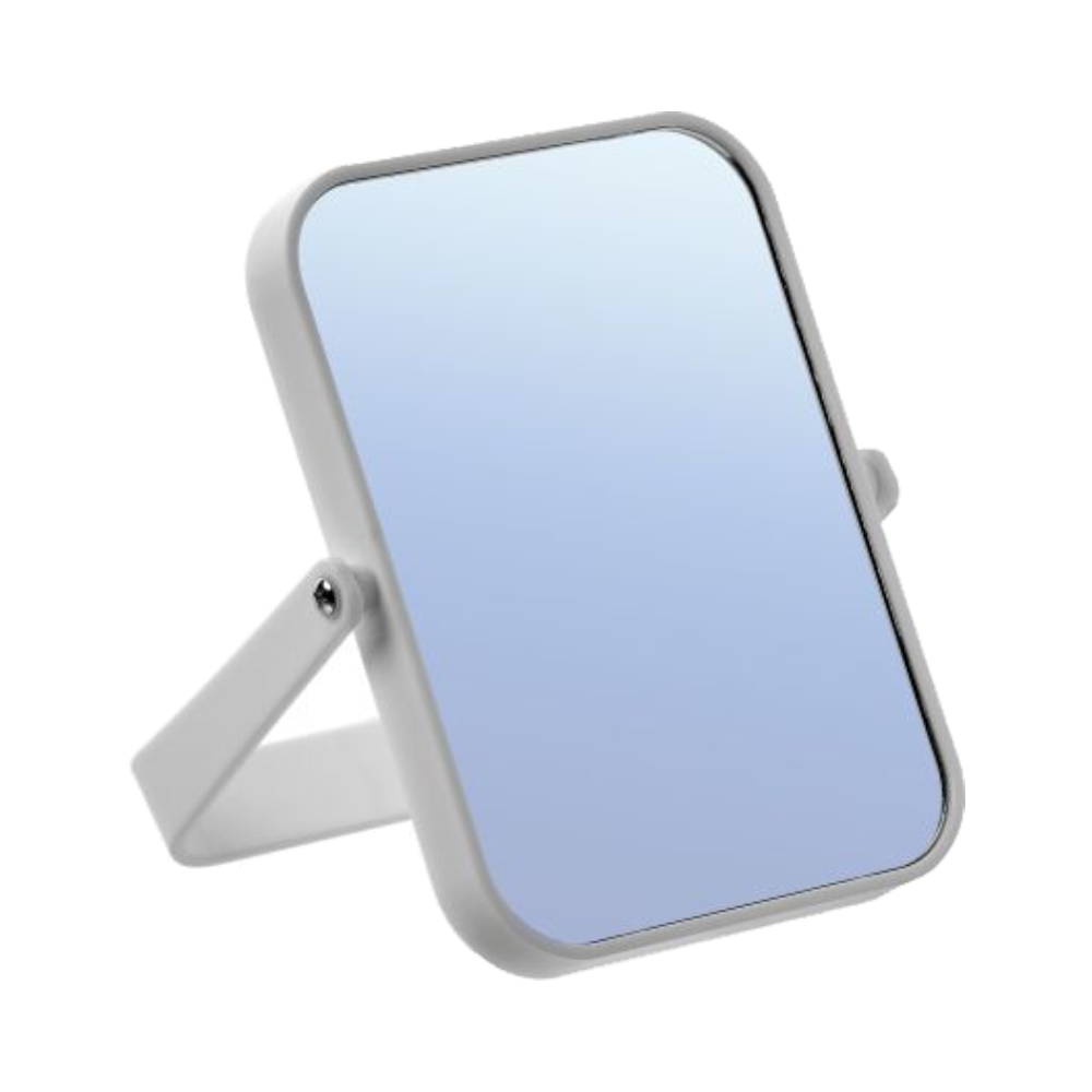 Зеркало косметическое прямоугольное двустороннее в пластиковой оправе с подставкой. С одной стороны зеркало обычное, с другой - с двойным увеличением. Размер изделия 15х19 см.